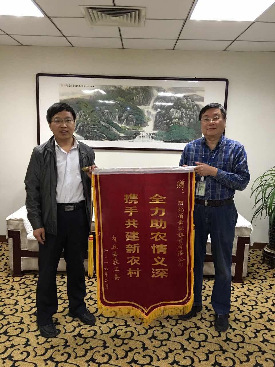 一年來(lái),河北金租駐村工作隊(duì)與孫家坡村的干部群眾打成一片。在省市黨組織部門(mén)的抽查、突查中均未出現(xiàn)漏崗,中秋節(jié)、元旦等假日也堅(jiān)守崗位,受到省國(guó)資委領(lǐng)導(dǎo)、各級(jí)扶貧辦和村民的一致好評(píng)。駐村工作隊(duì)榮獲內(nèi)丘縣扶貧辦、農(nóng)工委頒發(fā)的“2015年度扶貧工作先進(jìn)集體”稱(chēng)號(hào),工作隊(duì)曹津生榮獲“2015年度扶貧工作先進(jìn)個(gè)人”稱(chēng)號(hào)。近日,內(nèi)丘縣農(nóng)工委特向公司贈(zèng)送一面錦旗,表達(dá)了“全力助農(nóng)情誼深,攜手共建新農(nóng)村”的感謝之情。