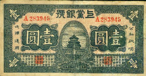 1938年,為了獨立自主地發(fā)展和鞏固根據(jù)地,嚴防蔣介石、閻錫山經(jīng)濟封鎖,晉東南抗日根據(jù)地在沁縣成立上黨銀號,發(fā)行“上黨票”。上黨票初發(fā)行時與法幣、晉鈔、銀元以及根據(jù)地各縣銀號發(fā)行的縣票同時流通于晉東南、晉南、晉中、冀南等部分縣域,1938年發(fā)行的面額有拾元、伍元、貳元、壹元、伍角、貳角伍分、貳角、壹角等8種票面10種版別。壹元票的主圖設計為體現(xiàn)根據(jù)地貨幣特色,天壇主圖的下面倒印有一“黨”字暗記。1940年初,“上黨銀號”結(jié)束,其財產(chǎn)并入“冀南銀行”時,共發(fā)行上黨票300余萬元。