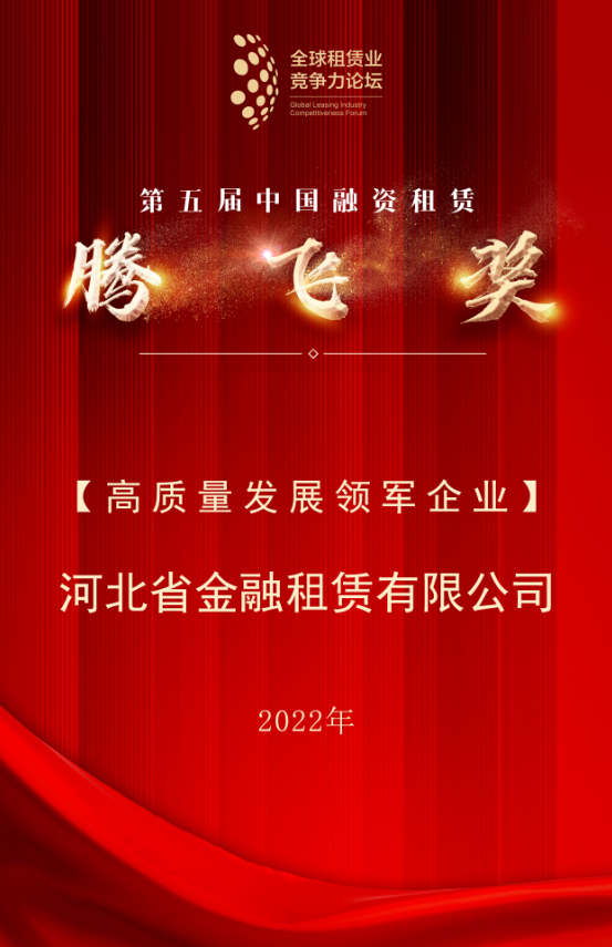 2023-01-11日前,第九屆全球租賃業競爭力論壇年度峰會圓滿召開,河北省金融租賃有限公司(以下簡稱“河北金租”或“公司”)再度攬下中國融資租賃“騰飛獎”,榮獲“高質量發展領軍企業”榮譽。全球租賃業競爭力論壇峰會是一年一度的世界級租賃行業峰…